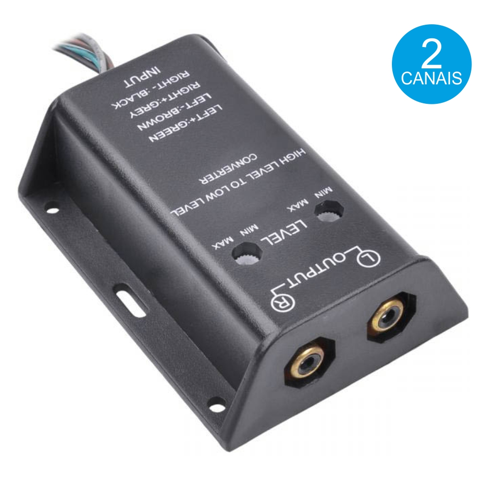 - Adaptador conversor RCA - Controlo de nível p/ cada canal - Número de canais: 2, fichas RCA - Converte alta p/ baixa impedância - Estrutura metálica robusta
