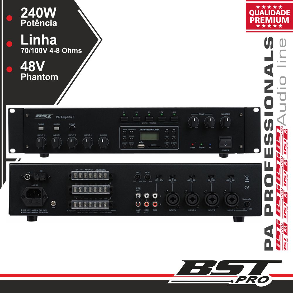 Home AMPLIFICAD AMPLIFICADOR PA PHANTOM 24V 240W 4 ZONAS USBSDAMFM BSTPRO AMPLIFICADOR PA PHANTOM 24V 240W 4 ZONAS USBSDAMFM BSTPRO SKU: UPA240TU 369,00 € Desconto de %. IVA incluído. O produto encontra-se sem stock. Adicionar à wishlist - Amplificador 19" 2U 240W 4 Zonas - 6 Entradas: 4 MIC (1 c/ Phantom 48V), 1 Linha e 1 EMC, função prioritária no MIC1 e EMC - Leitor MP3 USB/SD c/ LCD e Rádio AM/FM - Saídas: 240W 4-16 Ohms / 70V / 100V - Alimentação: 230Vac e 24Vdc, 484x88x320mm Marca BSTPRO Tags ÁUDIO PROFISSIONAL EQUIPAMENTOS PARA INSTALAÇÕE Características Partilhar