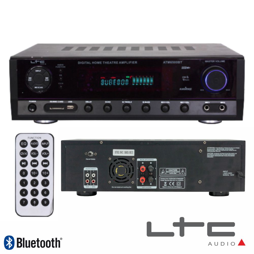 Home AMPLIFICADORES AMPLIFICADOR STEREO HIFI 2X50W + 3X20W USBFMBTSD LTC AMPLIFICADOR STEREO HIFI 2X50W + 3X20W USBFMBTSD LTC SKU: ATM6500BT 102,50 € Desconto de %. IVA incluído. Comprar Contactar Adicionar à wishlist - Amplificador Stereo c/ sintonizador digital - Potência saída: 2x 50Wmáx, comando IR - 2 Entradas MIC, tela de espectro - Leitor USB/SD embutido c/ Bluetooth e FM - Frequência resposta: 20-20.000Hz - Tensão funcionamento: 230VAC Marca LTC Tags TV VÍDEO E MULTIMÉDIA HOME CINEMA E HI-FI AMPLIF Características Partilhar