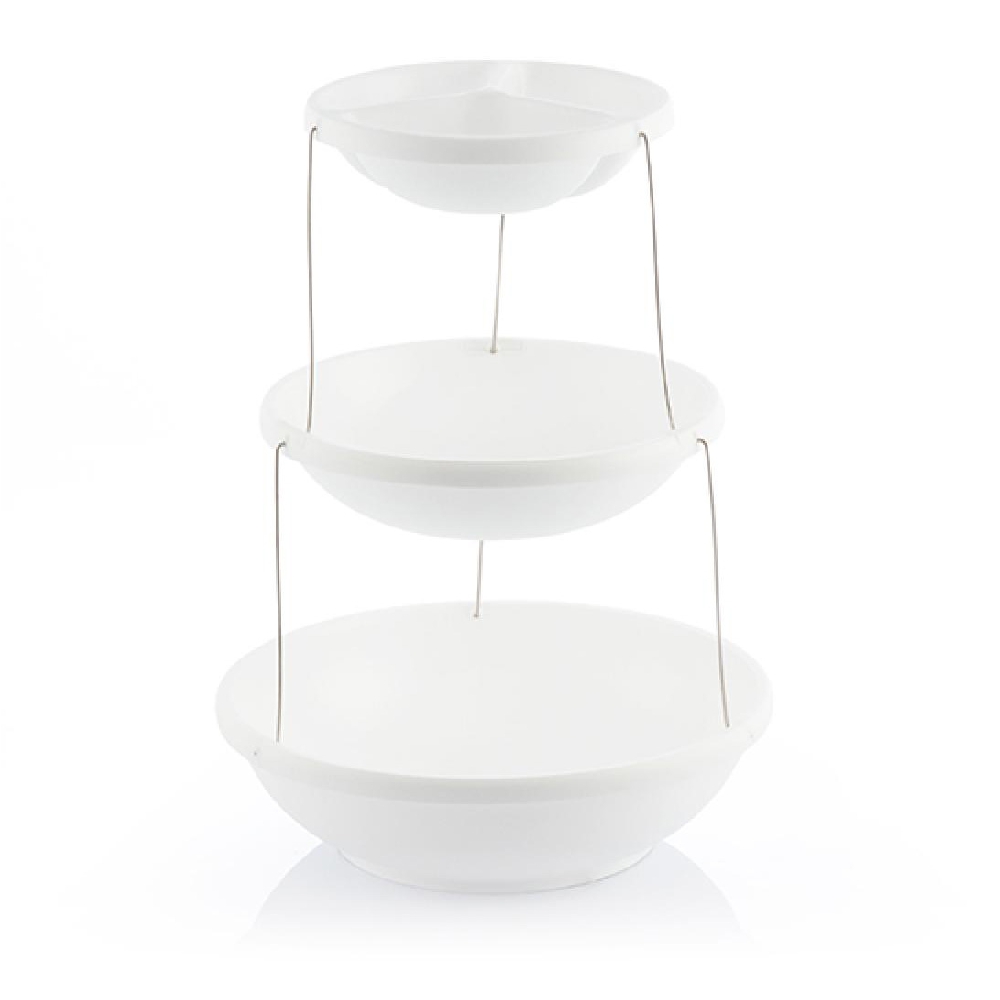 - Base dobrável e rotativa p/ snacks 3 andares - Feito de polipropileno, íman e aço inoxidável - 3 Placas c/ medidas diferentes - 3 Alturas ou níveis, livre e BPA - Design moderno e inspirado no origami - Dobra e desdobra automáticamente