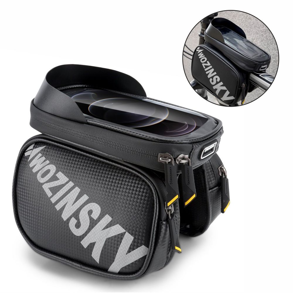 - Bolsa de telemóvel p/ quadro de bicicleta - Equipada c/ 2 compartimentos de arrumação - Estrutura à prova de água c/ janela frontal - Janela protectora que assume o toque - Compatível c/ telemóveis até 6.5" - Dimensões: 20x14x13cm