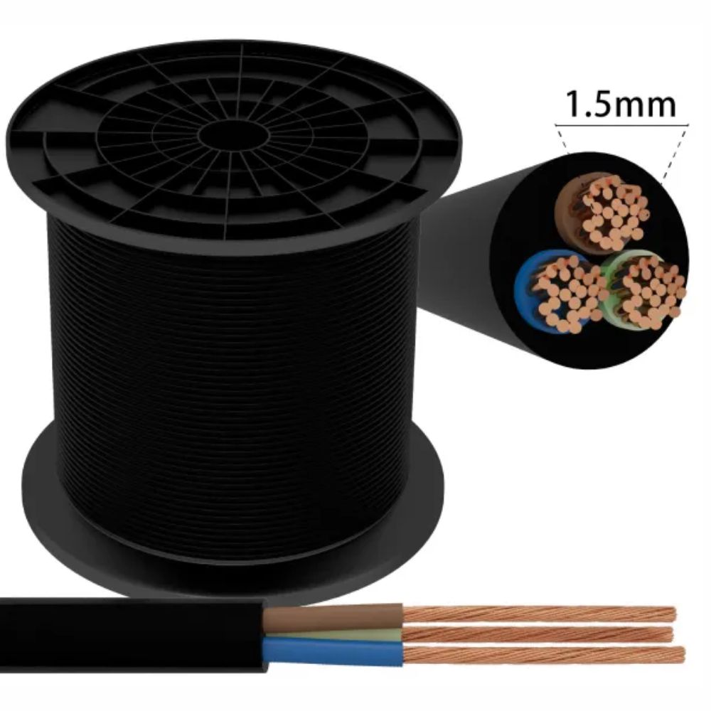 - Cabo alimentação elétrico 3 condutores - Condutores: 3 condutores H05VV-F de 1.5mm² - Cores: azul, castanho e bicolor - Revestimento exterior em PVC preto retardante de chama - Cobre sem oxigênio de alta qualidade - PREÇO/M DISPONÍVEL EM ROLO DE 100M