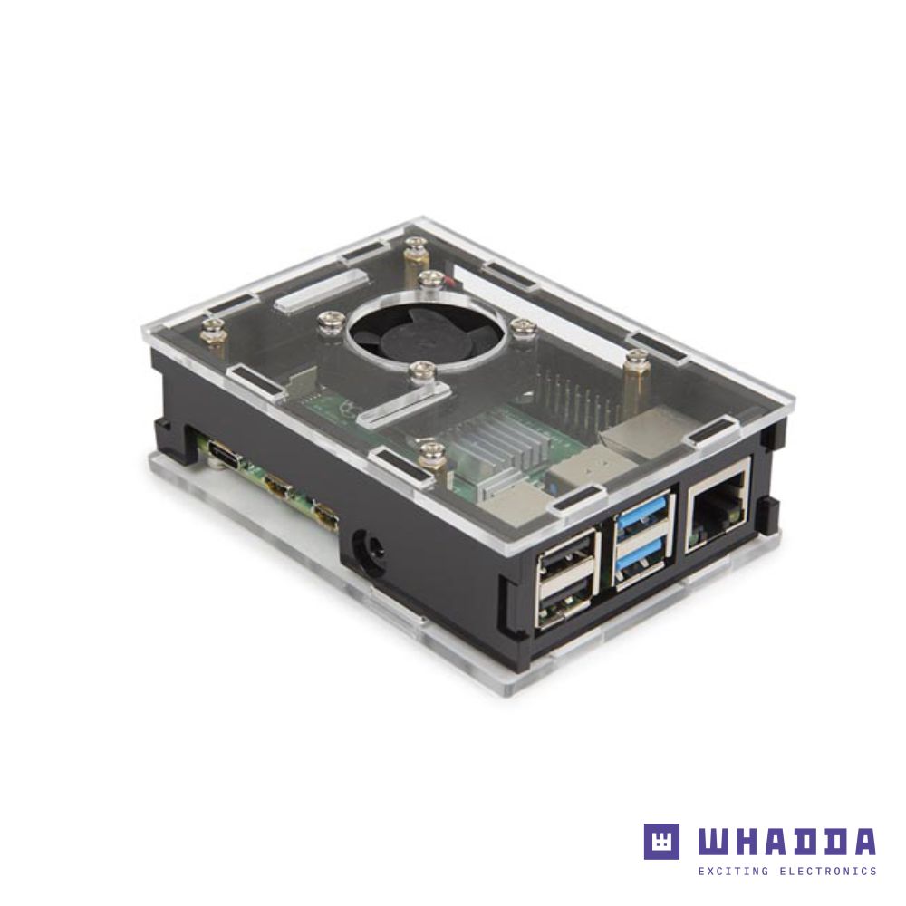 - Ventoinha embutida p/ Raspberry Pi 4 - Base e topo em acrílico transparente - Adequado para Raspberry Pi 4 - Entradas: 2x USB 2.0 / 2x USB 3.0 / RJ45 / Cartão SD / 3x HDMI - Material de montagem incluído