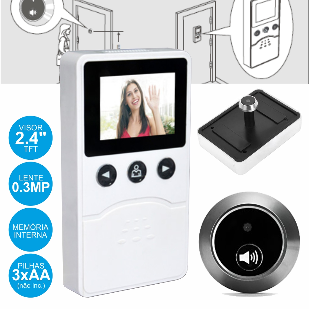 - Câmera Ocular digital p/ porta c/ visor TFT 2.4" - Substitui o óculo tradicional, fácil de instalar - Resolução da câmara: 0.3MP, 320x234 - Autonomia bateria (aproximado): 3600h - Função de captura imagem e vídeo até 10s - Alimentação: 3x AA (não inc.), inclui acessórios