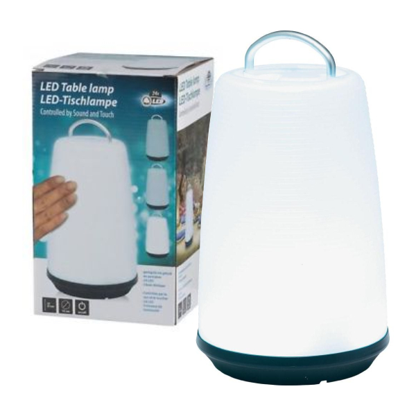 - Candeeiro a LEDs c/ DIMMER - Número de LEDs: 24 LEDs brancos - Dimmer ajustável c/ 3 níveis intensidade - Alimentação: 3x AA (não inc.) - Diâmetro: Ø130mm, altura: 210mm - Modo de controlo por Som e Toque