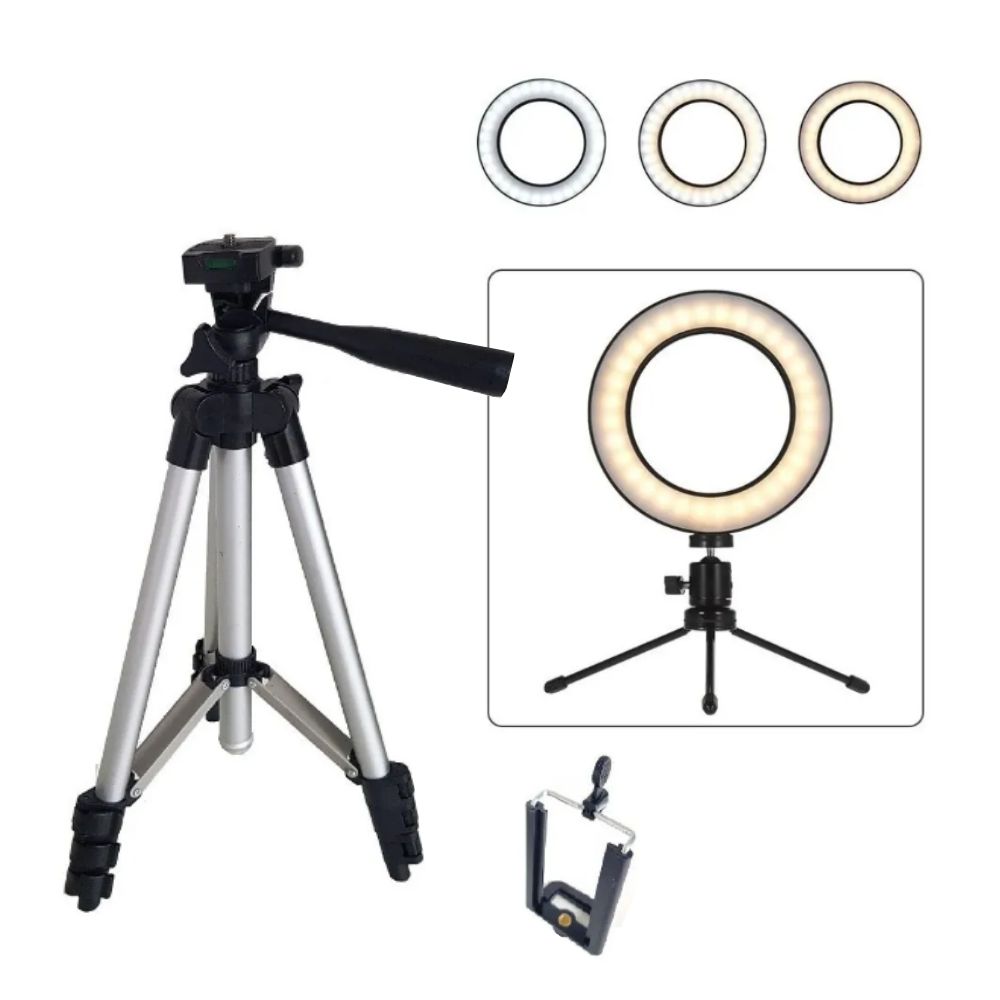 - Suporte p/ telemóvel universal - Anel LED 10" c/ regulador de intensidade luz - 3 cores de luz selecionáveis, Ø25.4cm - Alimentação via USB 5V - Inclui: 1 Suporte mesa e 1 suporte de chão - Suporte de chão com altura ajustável
