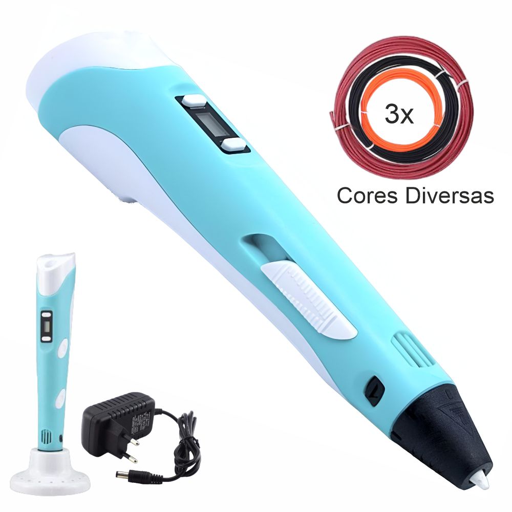 - Caneta 3D c/ Ecrã indicador de temperatura - Botões laterais p/ controlo temperatura - Desliga-se após 5 minutos de inatividade - Compatível c/ filamentos 0.7mm PLA ou ABS - Inclui 3 filamentos de 3m em cores diversas - Contém: Suporte e Alimentador 12V 2A