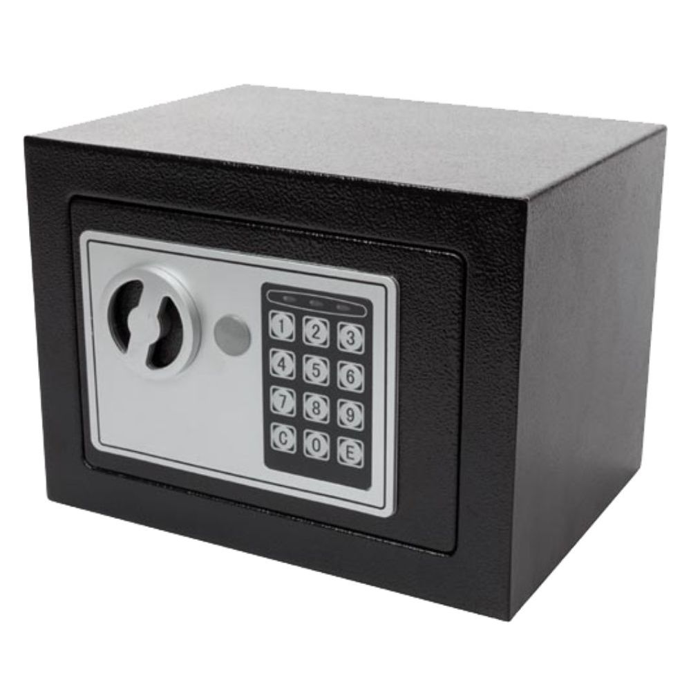 - Cofre eletrónico de alta segurança em Aço - Sistema segurança c/ 2 eixos de bloqueio - Chave de sobreposição, inclui 2 chaves - Alimentação: 4x AA (inc.), teclado numérico - Estrutura em Aço c/ 1mm e porta c/ 2.5mm - Interior: 16x22x12cm, Exterior: 17x23x17cm