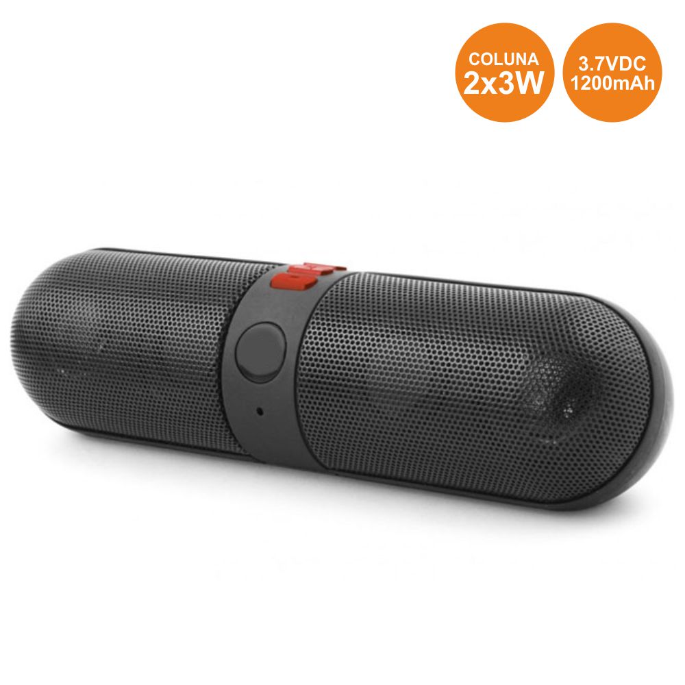 - Coluna Bluetooth portátil c/ bateria - Compatível c/ dispositivos móveis, PC e MAC - Potência: 2x3W, leitor Bluetooth, FM e SD - Bateria interna Li-Po 3.7V 1200mAh - Frequência resposta: 280-16.000Hz - Dimensões: 193 x 51 x 51 mm