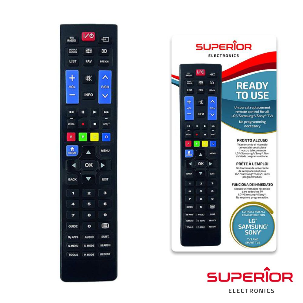 - Comando TV universal p/ TV LG/Samsung/Sony - Cobre todas funções do comando original - Alimentação: 2 Pilhas AAA (não inc.) - Livre de programação, operação simples - Funções especiais p/ SMART TV - Estrutura em ABS Preta, em Blister