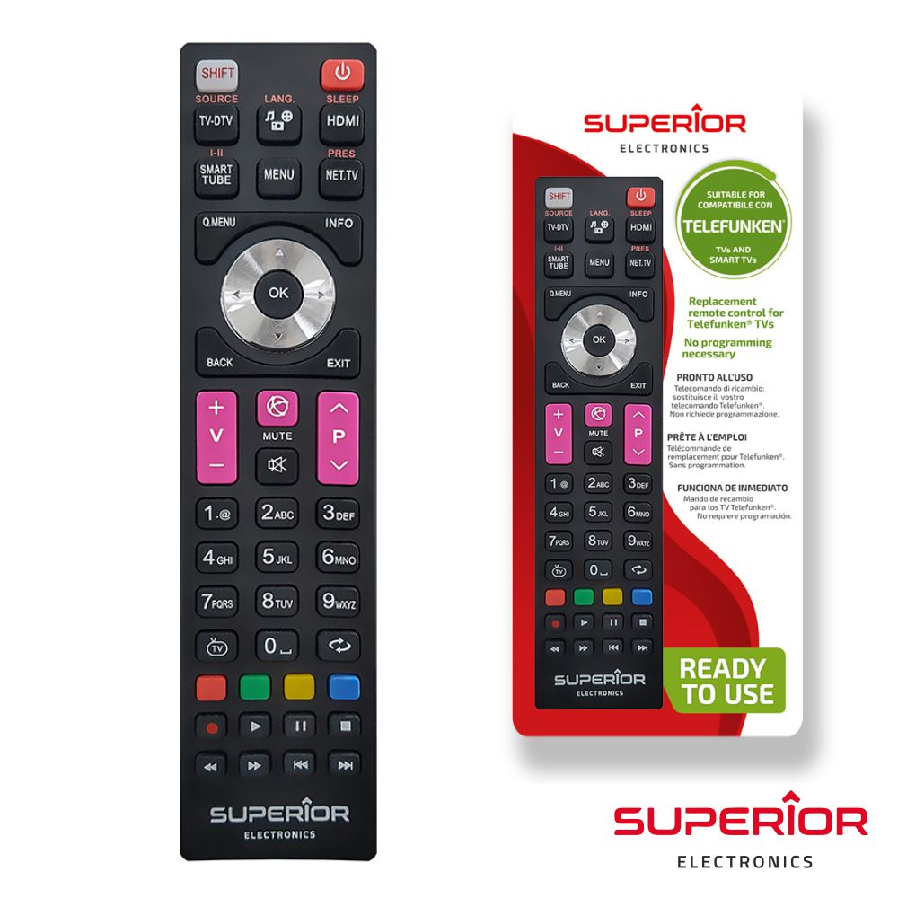 - Comando TV universal p/ TV TELEFUNKEN - Cobre todas funções do comando original - Alimentação: 2 Pilhas AAA (não inc.) - Livre de programação, operação simples - Funções especiais p/ SMART TV - Estrutura em ABS Preta, em Blister