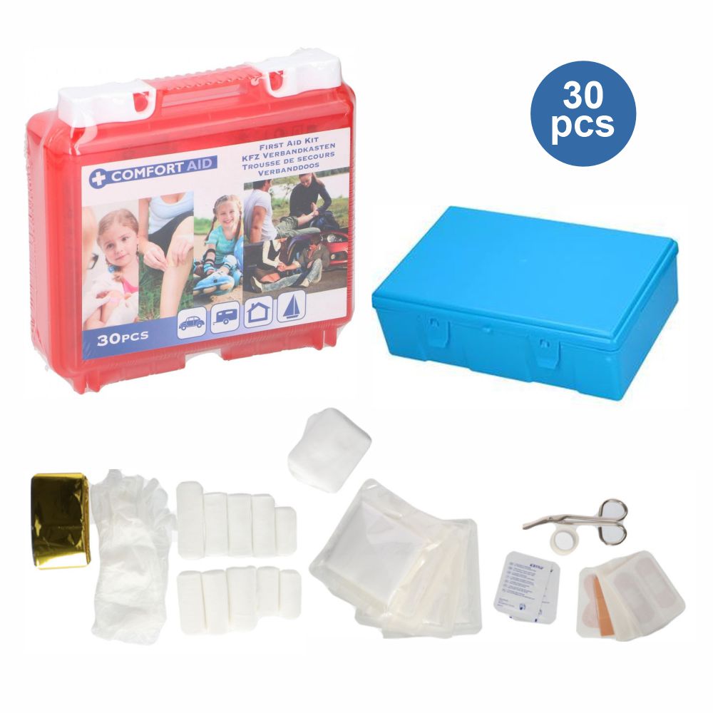 - Kit de primeiros socorros - Composto por 30 peças diversas - Mala de transporte compacta - 4 Pacotes de gazes estéreis, pensos, 1 Cobertor térmico de emergência, Compressas, luvas, toalhetes, algodão e tesoura