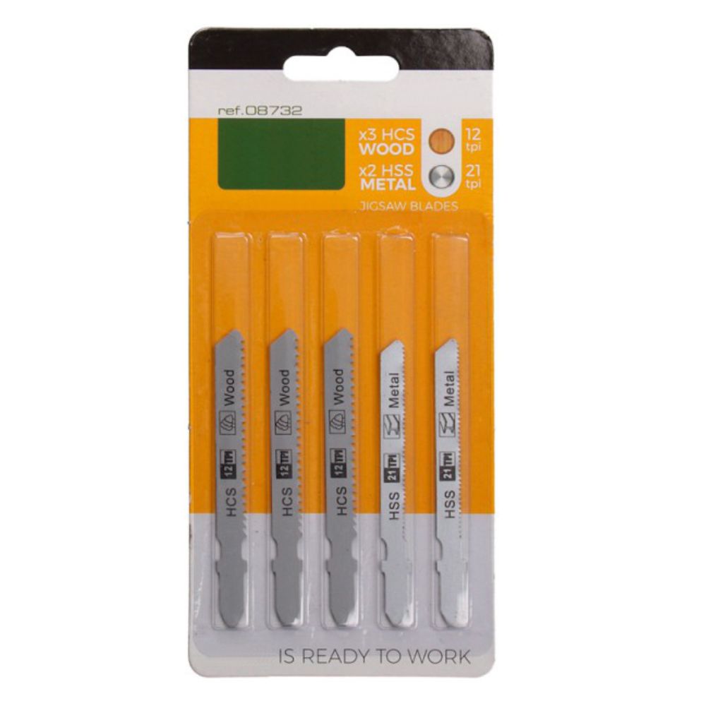 - Conjunto de serras p/ tico-tico - Composto por 5 serras - Lâminas: 3x p/ madeira e 2x p/ metal - Lâminas resistentes HCS-12TPI - Fornecido em Blister