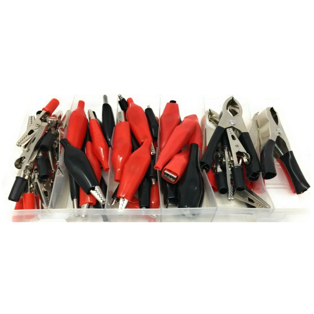 - Conjunto 60 pinças crocodilo - Pinças de crocodilo 38mm - Pinças de crocodilo 50mm - Pinças de crocodilo 10A - Pinças de crocodilo 25A - Pinças de crocodilo 30A