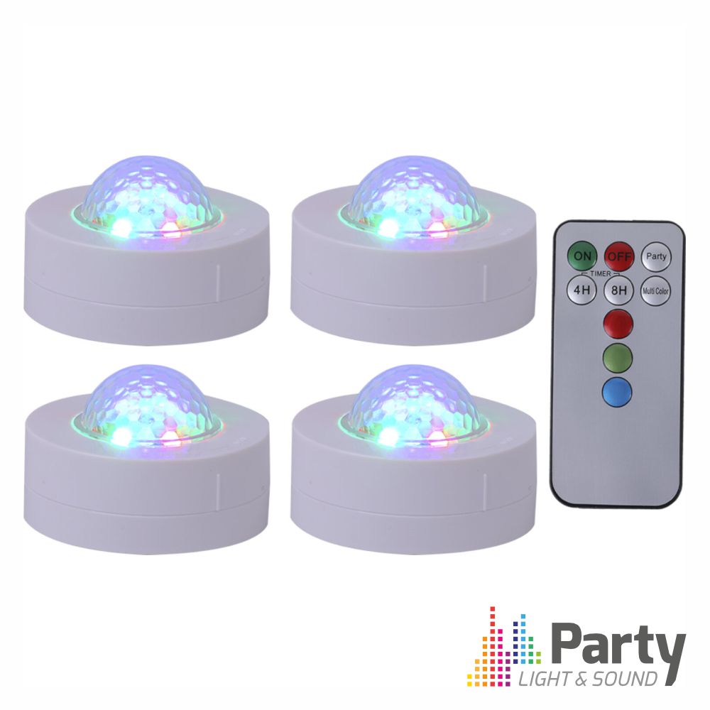 - Conjunto de 4 mini projetores de luz RGBW - Funções Strobe e Flash - Controlo individual ou conjunto - Controláveis através de comando sem fios - Temporizador com 2 modos - Alimentação: 4x pilhas AAA (incl.)