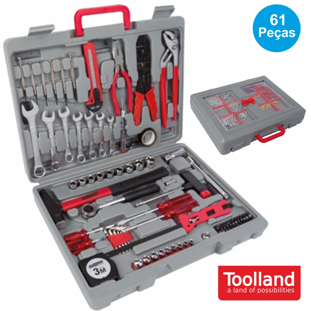 - Mala de ferramentas + acessórios - Equipada c/ 61 Peças alta qualidade - Composta por 6 chaves de precisão, 7 chaves de combinação, 1 x-acto, 1 alicate de eletricista de engaste e de bomba de água, 1 testador de eletricidade, Mala de transporte c/ fecho