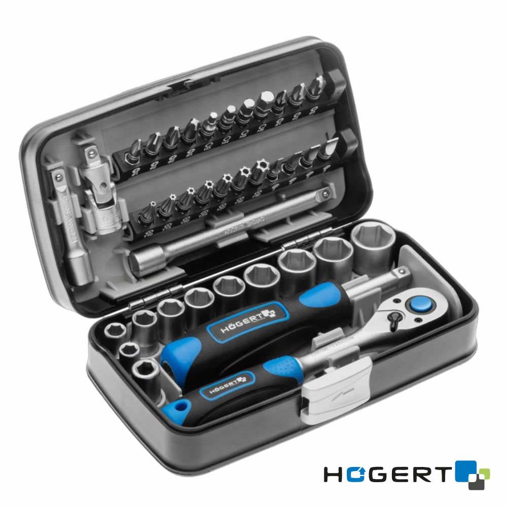 - Conjunto de ferramentas 38pcs. - Chaves e acessórios em liga de aço crómio-vanádio - Bits em liga de aço S2 - Mecanismo de roquete com 72 dentes - Caixa reforçada com dobradiças metálicas