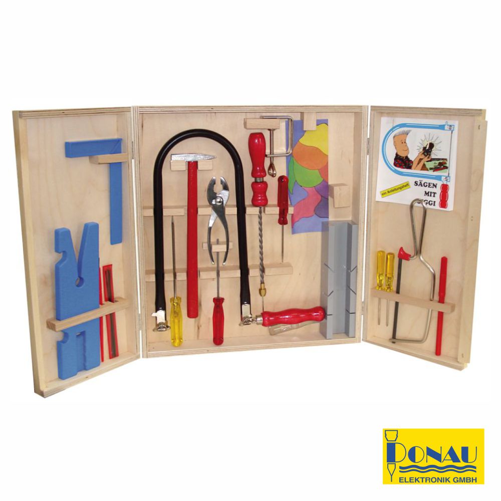 - Conjunto de ferramentas de bancada - Múltiplas ferramentas de alta qualidade - Composto por martelo, chaves de fendas, alicates, torno, serra de arco Segueta, etc. - Inclui conjunto de aquarelas c/ pincéis - Fornecido em armário de madeira c/ portas