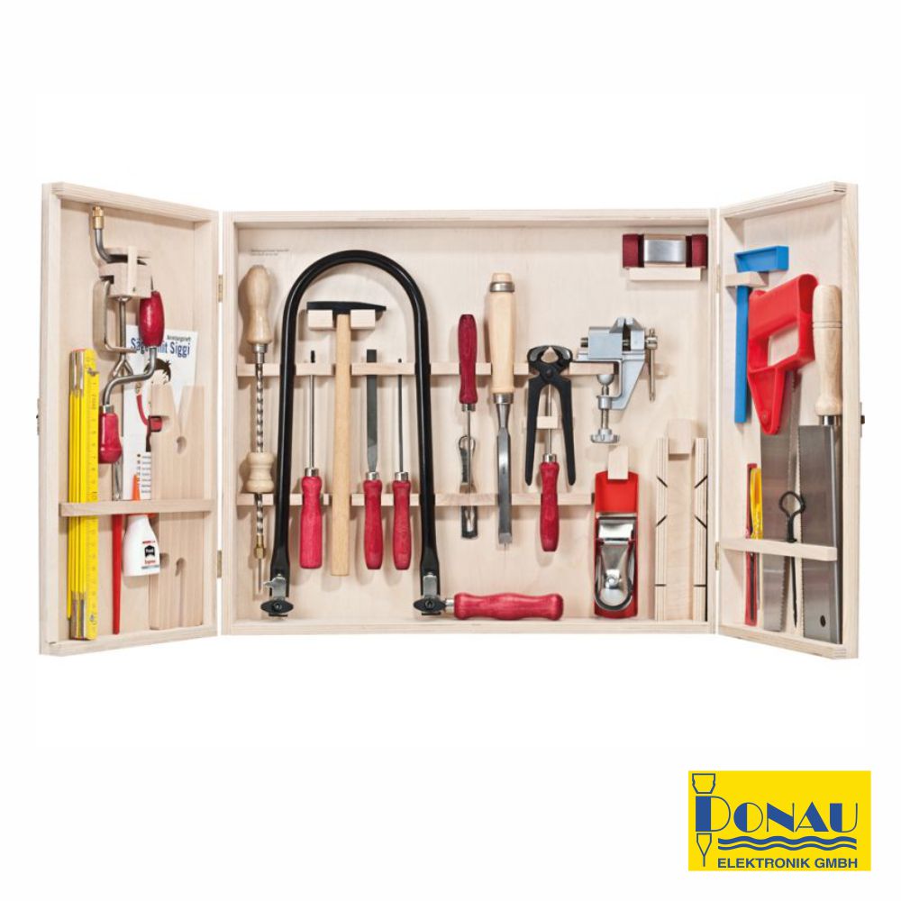 - Conjunto de ferramentas de bancada - Múltiplas ferramentas de alta qualidade - Composto por serra, pinças de Aço, plaina, régua, parafusos, escova, cola de madeira, brocas, braçadeira, serra de arco Segueta, etc. - Fornecido em armário de madeira c/ portas