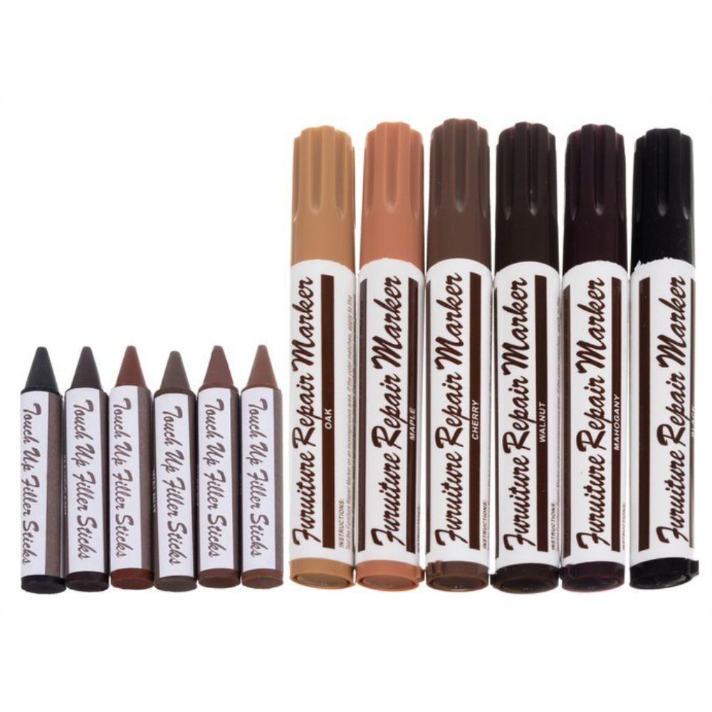 - Conjunto de 6 marcadores e 6 lápis de cêra - Tipos de madeira: carvalho, cerejeira, mogno , ácer, nogueira, preto - Secagem rápida - Permite renovar móveis, disfarçar riscos e reparar alguns danos em madeiras