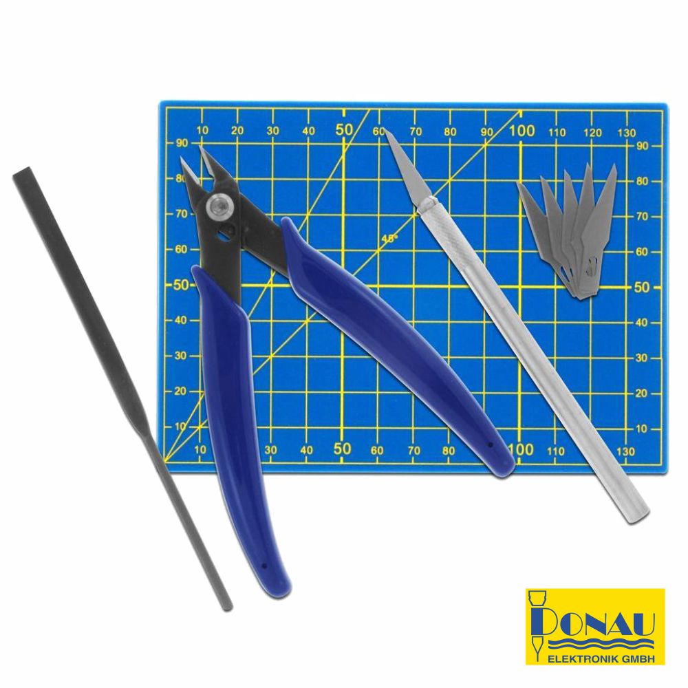 - Equipamento básico p/ modelagem - Tapete de corte autocurável 144x105x3mm - Cortador lateral p/ modelos de plástico - Faca X-ATO metálica c/ 134mm e 5 lâminas - Alicate de corte lateral e lima plana - Conjunto composto por 9 unidades