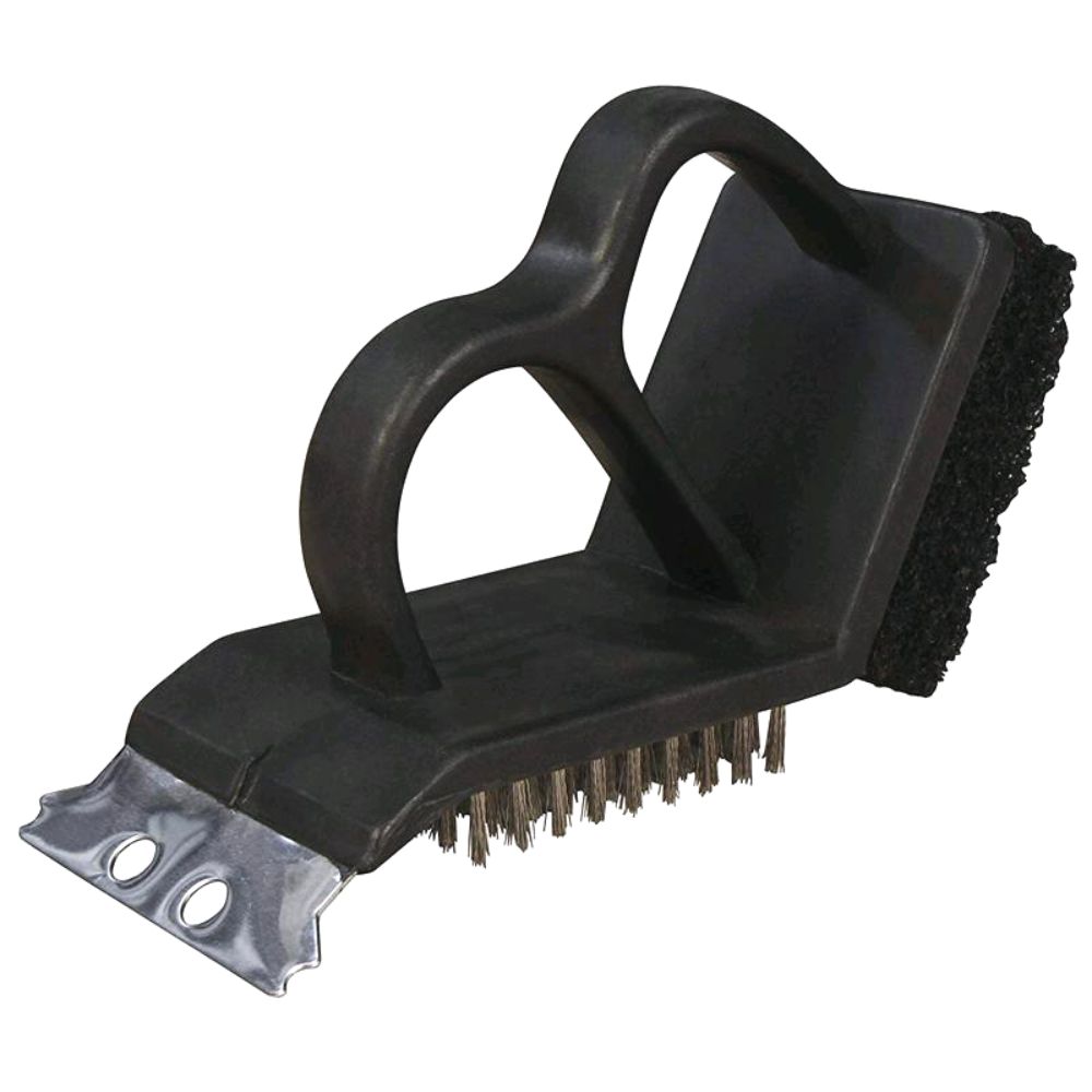 - Escova de arame para churrasco - Espátula metálica embutida p/ limpar a grelha - Escova c/ 2 tipos de cerdas de arame - Estrutura em plástico resistente - Cor: Preto