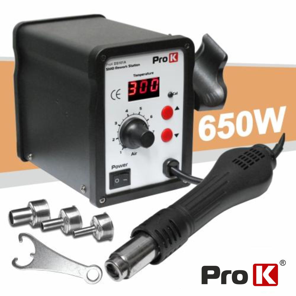 - Estação controlada por microprocessador - Fluxo de ar ajustável, saída de ar: 120L/min - Fornecido c/ 3 pontas standard e chave - Monitor temperatura LED, regulação até 500ºC - Tensão funcionamento: 230Vac, 650W