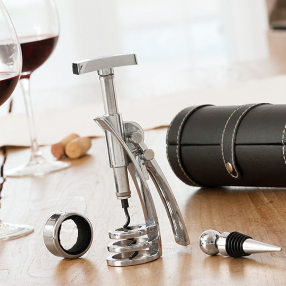 - Acessórios de ligação de zinco - Estojo tipo cofre de couro sintético de PU - Saca-rolhas Screwpull, tampa anti-gotas - Alavanca fixa p/ extrair a rolha verticalmente - Sem qualquer esforço e evitando quebras - Conjunto composto por 4 peças