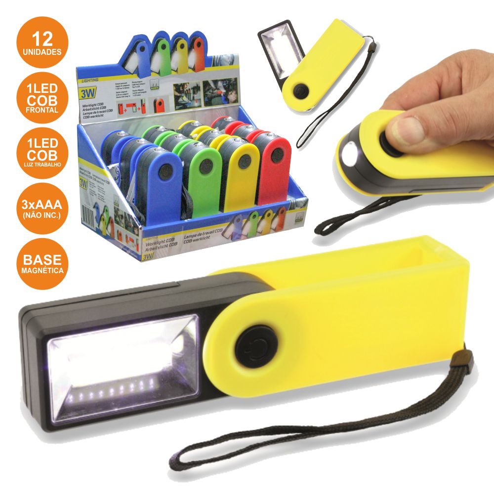 - Expositor 12 Lanternas c/ base magnética - 1 LED COB frontal + luz trabalho (COB) 3W - Luz de trabalho que liga e desliga ao abrir - Base magnética p/ superfícies metálicas - Alimentação (canterna): 3x AAA (não inc.) - Cores: azul, verde, amarelo e vermelho