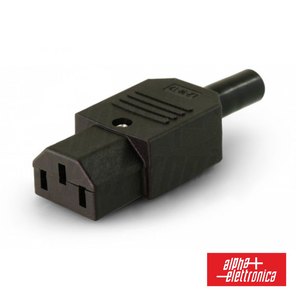 - Ficha de alimentação IEC C13 Fêmea - Equipada c/ proteção p/ cabo - Estrutura em termoplástico Preto - Reforçada c/ fibra de vidro - Contactos em liga de cobre - Terminais de parafuso