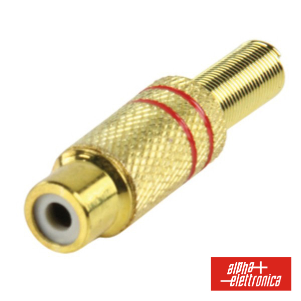 - Ficha RCA Fêmea Dourada - Proteção de cabo em Mola - Corpo em Bronze, contactos Dourados - Adequado para cabo de ø4mm - Disponível em 2 cores: Preto e Vermelho