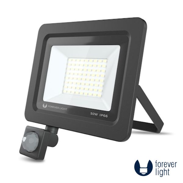 - Foco LED 50W com sensor PIR - Tensão funcionamento: 230VAC - Tipo de LED: LEDS SMD 2835 - Intensidade luminosa: 4000 Lumens - Branco Frio 6000K - Em Alumínio, Índice de proteção: IP66