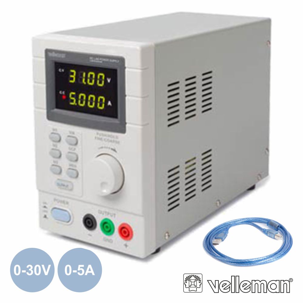 - Fonte de alimentação digital c/ visor LED - Ligação via USB ao PC p/ controlo remoto - Tensão entrada: 230Vac, 50Hz - Tensão saída: 0~30Vdc (regulável) - Corrente saída: 0~5A (regulável)
