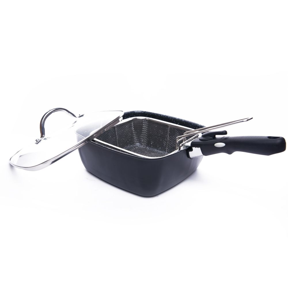 - Frigideira quadrada - Revestimento cerâmcio antiaderente - Material: Liga de aluimínio - Tampa de vidro - Cesto de fritar em aço inoxidável - Fácil de limpar