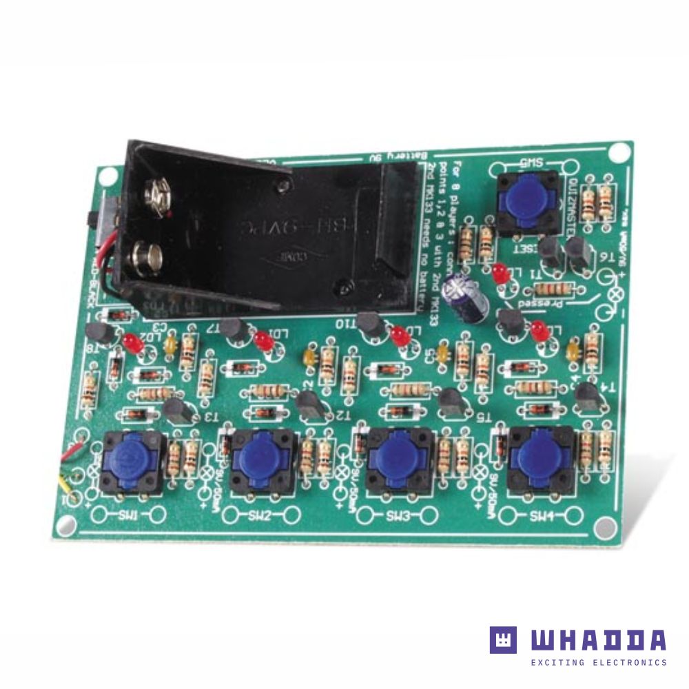 - 4 Botões para os jogadores do quiz - 1 Botão de reset - 4 LEDs vermelhos para indicar o jogador mais rápido - Pads de conexão p/ conectar botões externos ao kit - Botão liga/desliga