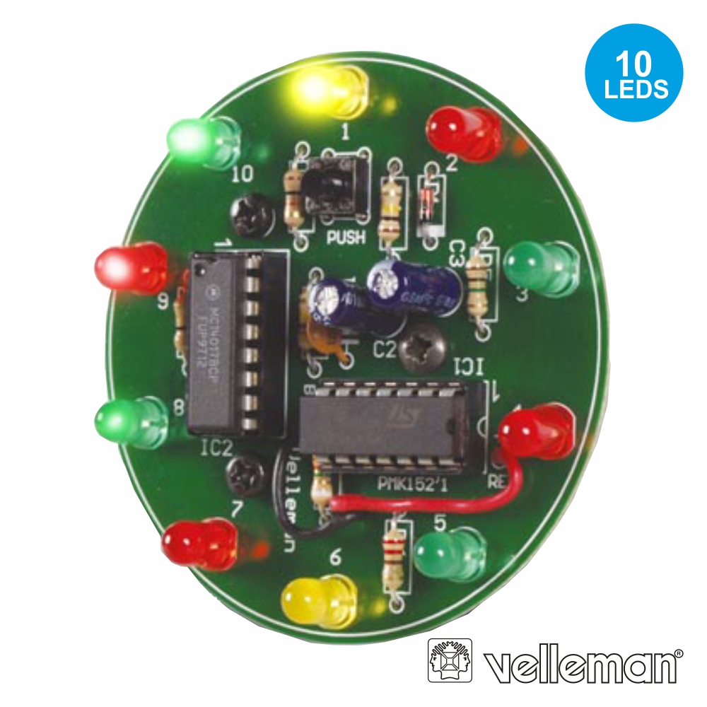 - Kit roda da sorte c/ 10 LEDS - Alimentação: bateria 9V (não incl.) - Prima a tecla para iniciar o jogo - A velocidade vai diminuindo gradualmente - Dimensões: Ø64 x 33mm