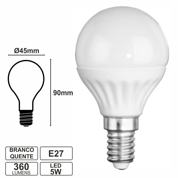 - Lâmpada E14 G45 Globo LED - Tipo de Casquilho: E14 - Tensão funcionamento: 230Vac - Potência: 5W=35W, Branco Quente - Temperatura cor: 3000k, 360 Lumens - Tempo de Vida útil: 25.000 Horas