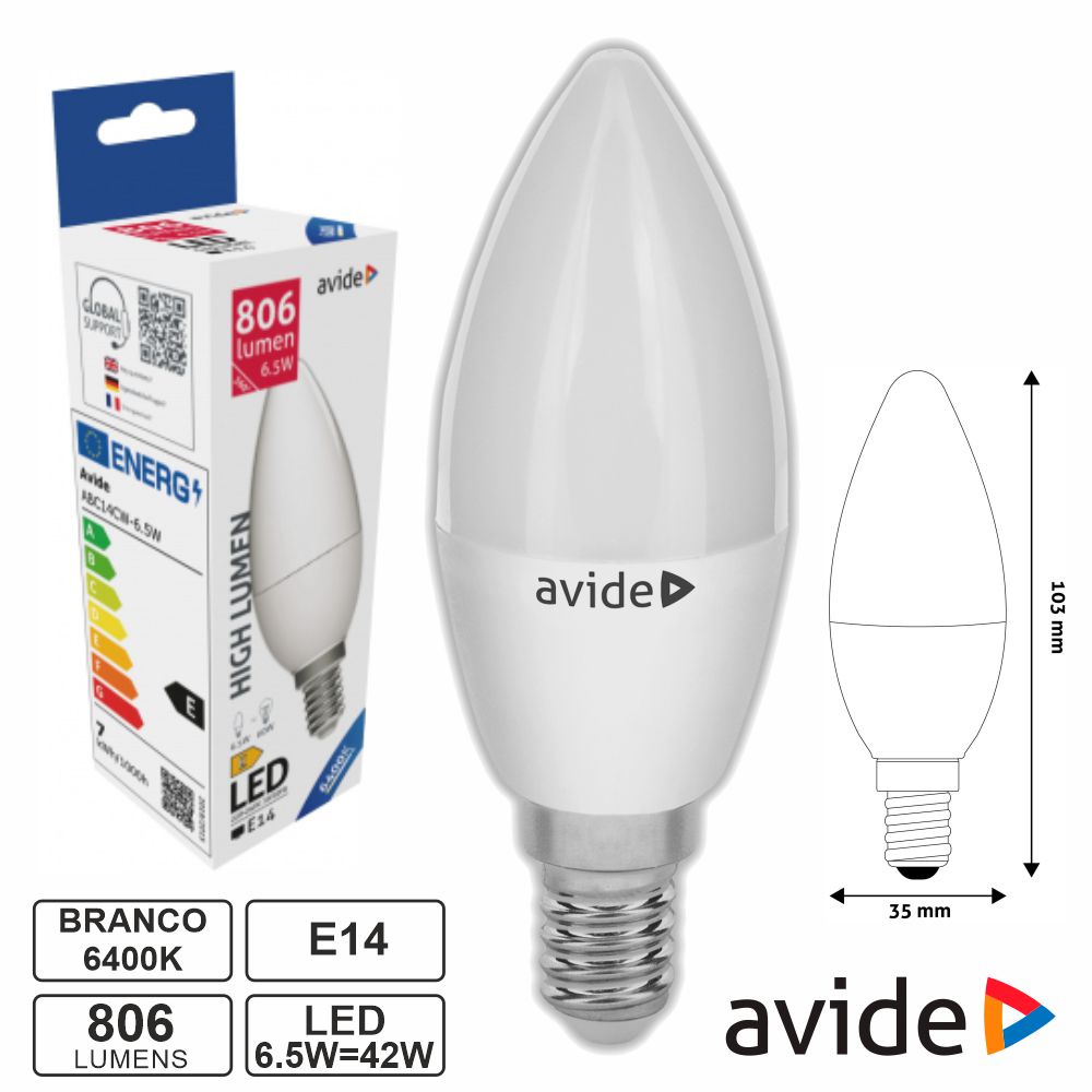 Home LEDS E14 Lâmpada LED E14 Vela 6.5W 230V 6400K 806lm AVIDE Lâmpada LED E14 Vela 6.5W 230V 6400K 806lm AVIDE SKU: ABC14CW-6.5W 1,60 € Desconto de %. IVA incluído. Comprar Contactar Adicionar à wishlist - Lâmpada E14 Vela LED - Tipo de Casquilho: E14 - Tensão funcionamento: 230VAC - Potência: 6.5W=60W, Branco Frio - Temperatura cor: 6400K, 806 Lumens - Ângulo: 240º, Tempo vida: 15000h Marca AVIDE Tags ILUMINAÇÃO ILUMINAÇÃO LED LEDS E14 Características Partilhar