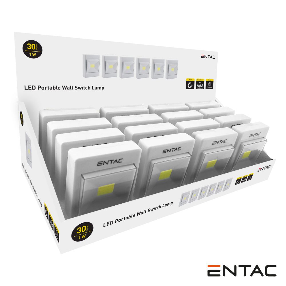 - Expositor de 16 Luzes de parede LED a pilhas - Equipado c/ 1 LED COB 1W Branco - Intensidade luminosa: 30 Lumens - 4x Pilhas AAA (não inc.) - Sistema de fixação magnético, com velcro ou parafuso