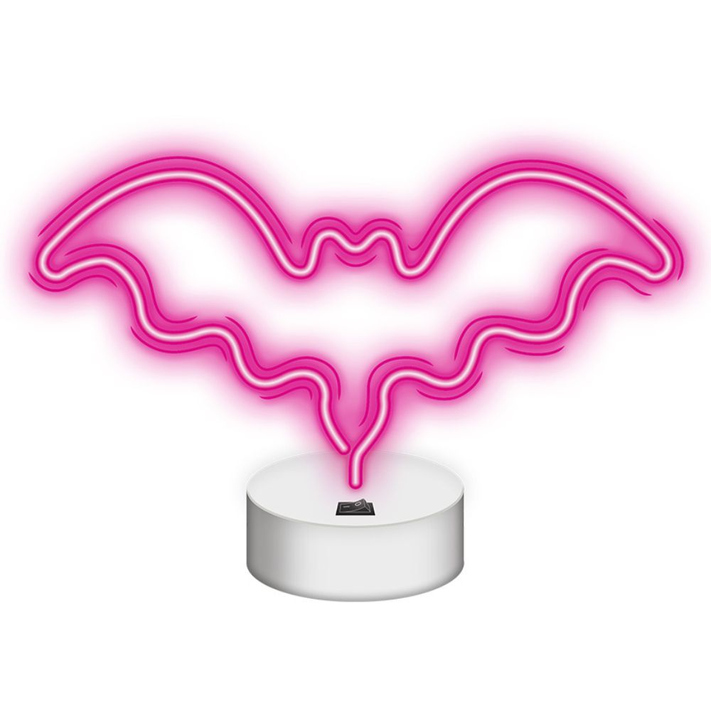 - Luz LED neon em forma de morcego - Ideal para decoração, Equipado c/ base redonda - Comprimento do cabo: 2m - Alimentação: 3x AA ou via USB 5V - Dimensões: 18x10x28cm