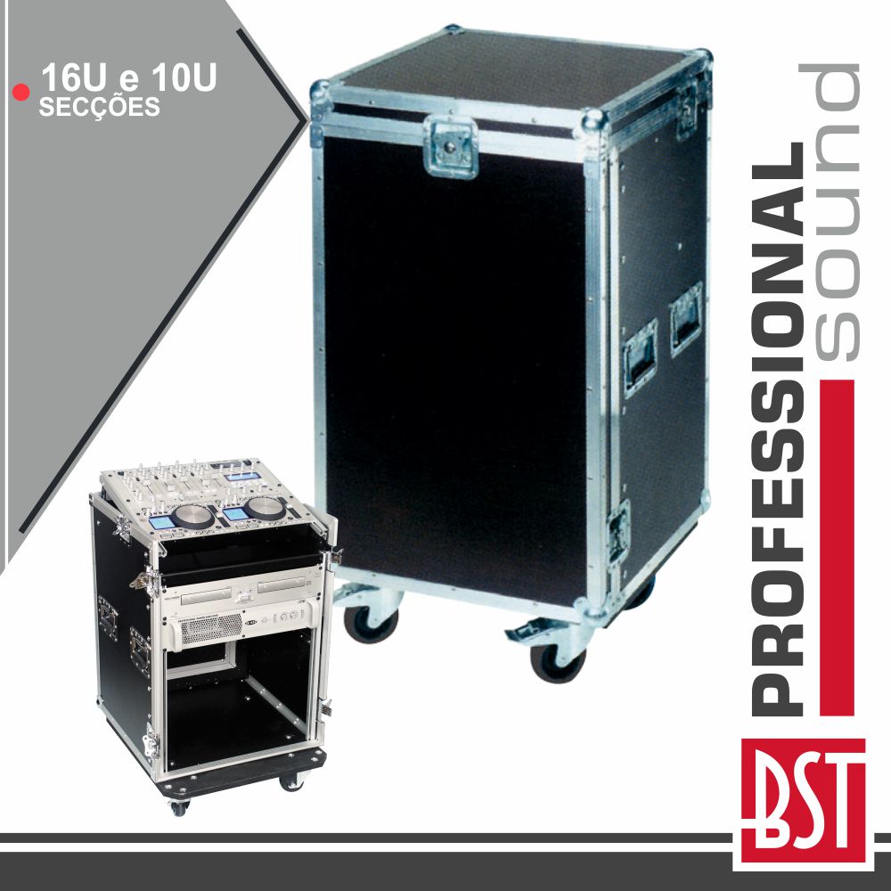 - Mala transporte c/ contraplacado 19mm - Perfil de Alumínio 30mm, 4 rodas (2 c/ bloqueio) - Painel frontal c/ 16U e 10U na parte superior - 4 Alças de transporte, montagem frente e trás - 7 Fechos borboleta, prfundidade 520mm