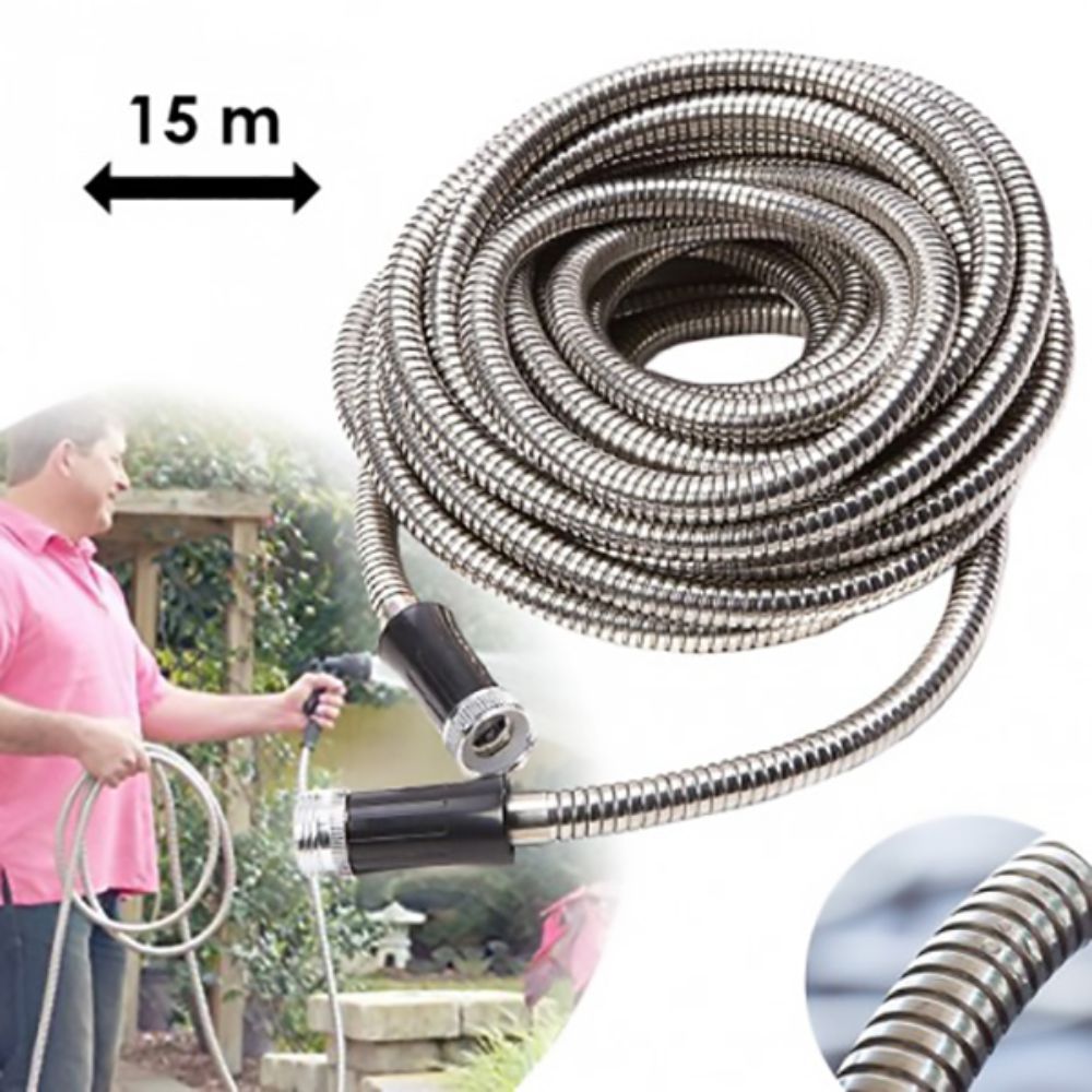 - Mangueira reforçada em aço - Resistente a choques e perfurações - Resistente a raios UV e temperatura - Interior flexível de borracha - Anti enrolamento - Comprimento: 15m