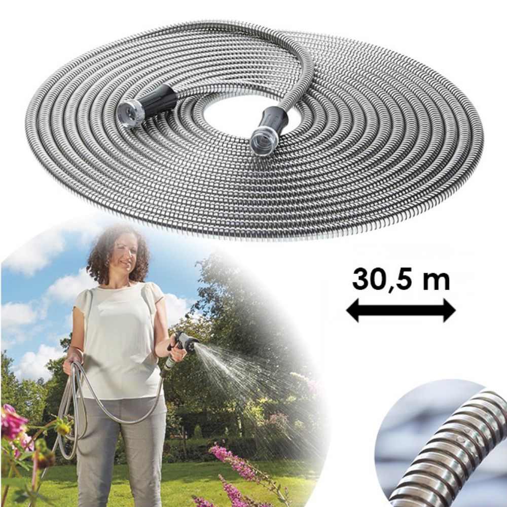 - Mangueira reforçada em aço - Resistente a choques e perfurações - Resistente a raios UV e temperatura - Interior flexível de borracha - Anti enrolamento - Comprimento: 30.5m