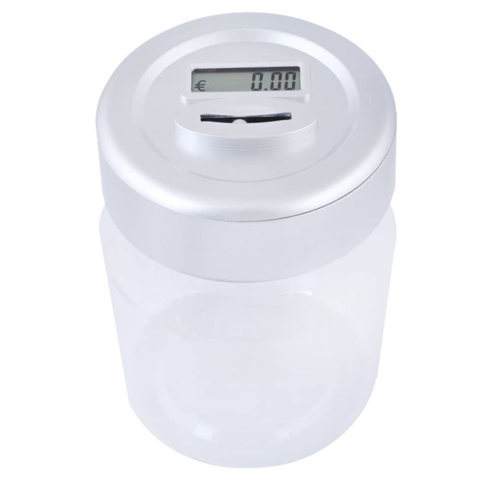 - Mealheiro contador de moedas com reconheci- mento das moedas Euro, somando os valores, exibindo o valor total no largo visor LCD - Alimentação: 2x AA 1.5V (não incl.) - Dimensões: 17x11.5cm