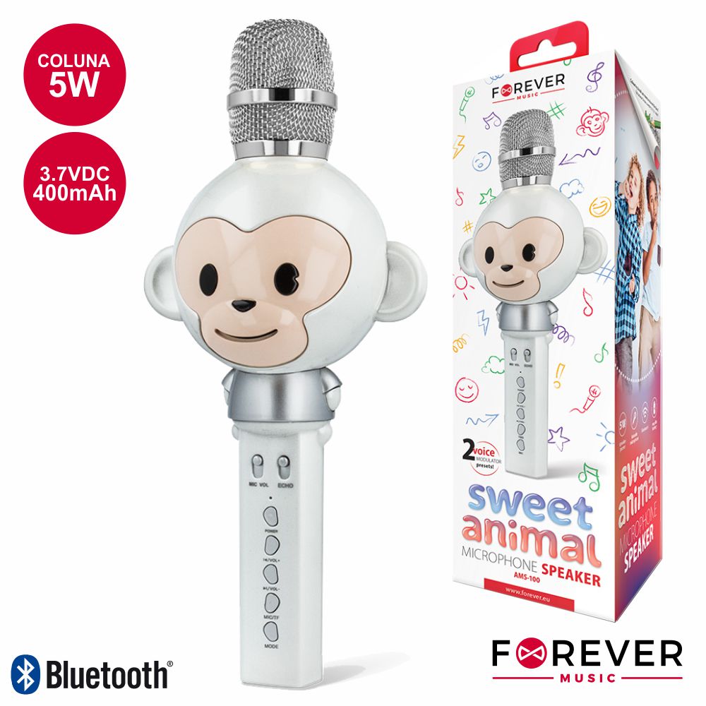 - Microfone c/ coluna Bluetooth 5W - Pode ouvir música e cantar ao mesmo tempo - Bateria Li-ion 3.7V 2000mAh, Bluetooth V4.0 - Modelo Sweet Animal: Macaco (Branco) - Efeito eco, modulador de voz c/ 2 modos - Frequência resposta: 100-10.000Hz, 115dB