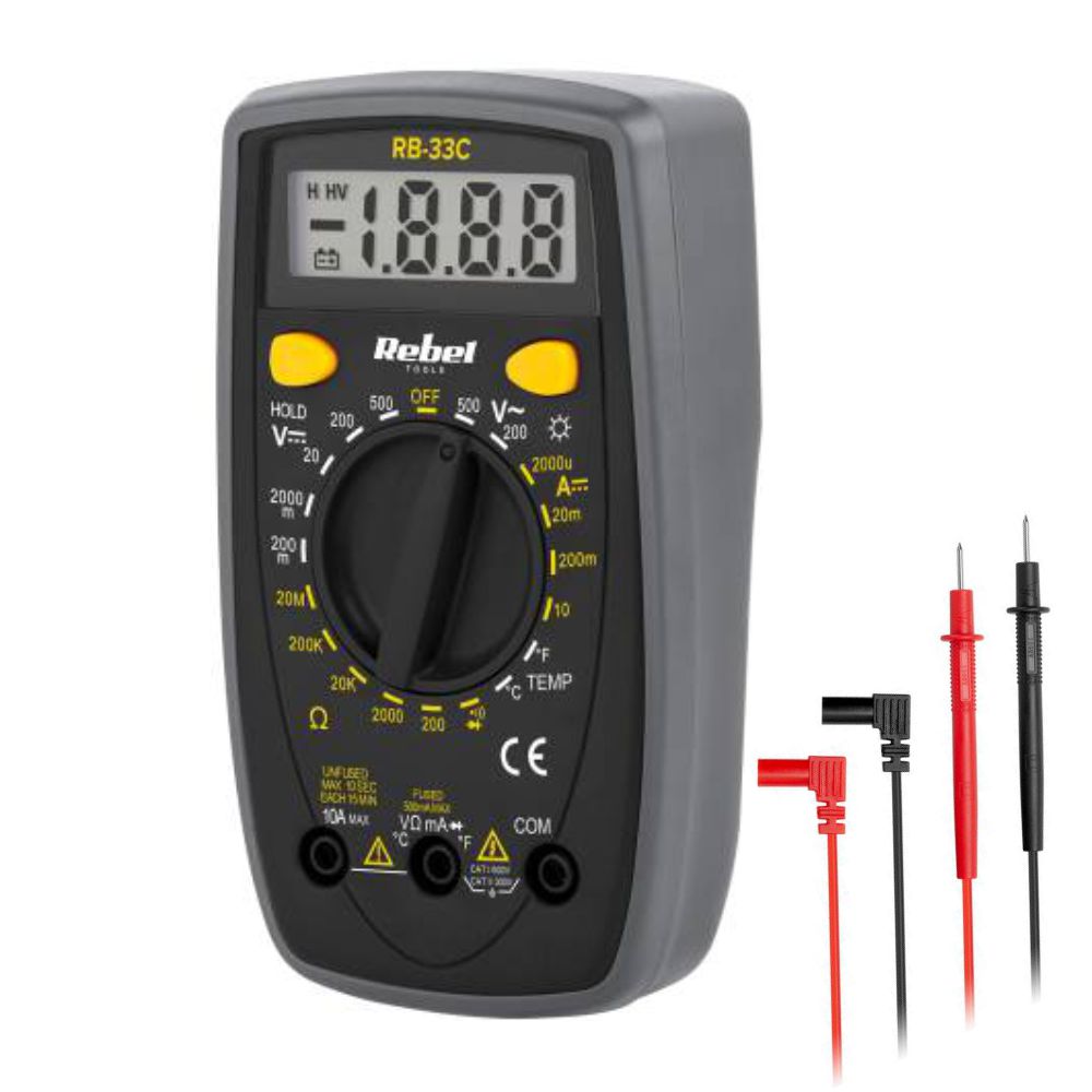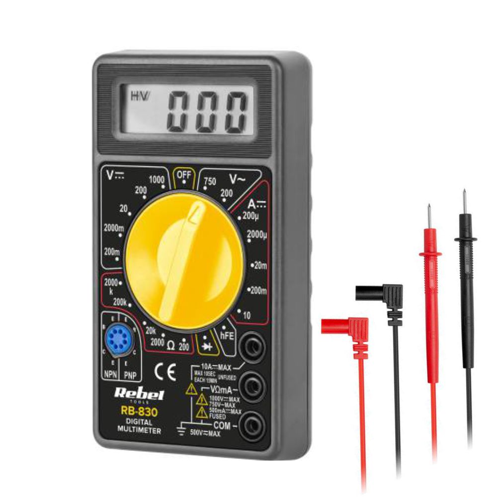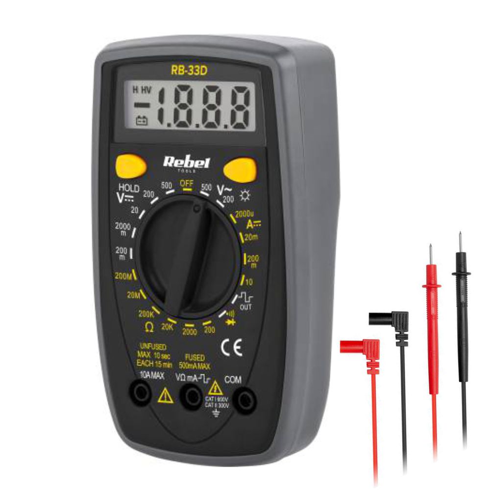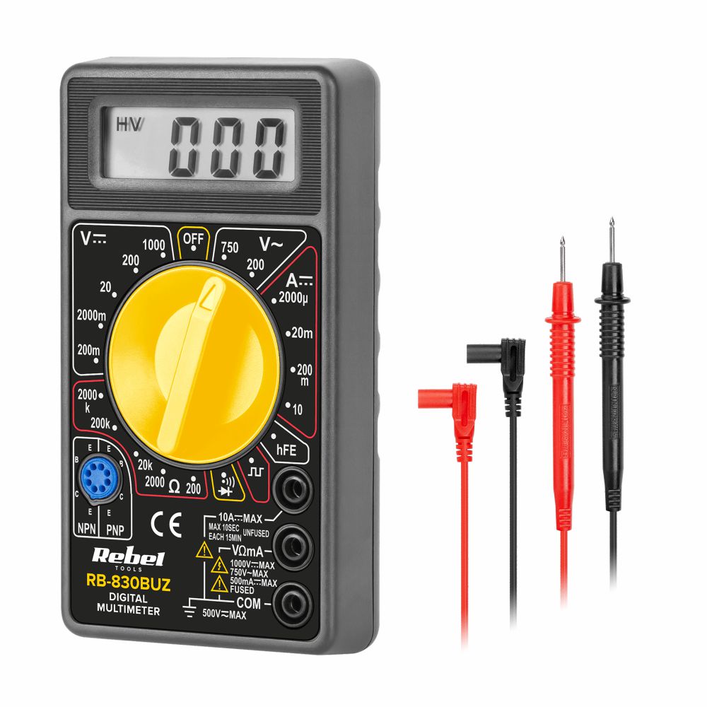 - Multímetro digital c/ Visor 3 ½ dígitos 1999 - Tensão DC: Até 1000V, Tensão AC: Até 750V - Teste de Continuidade, Medição temperatura - Indicação polaridade auto, ajuste Zero auto - Resistência até 2 MOhm, frequência e bateria - Alimentação: 2x AAA (não incluído)
