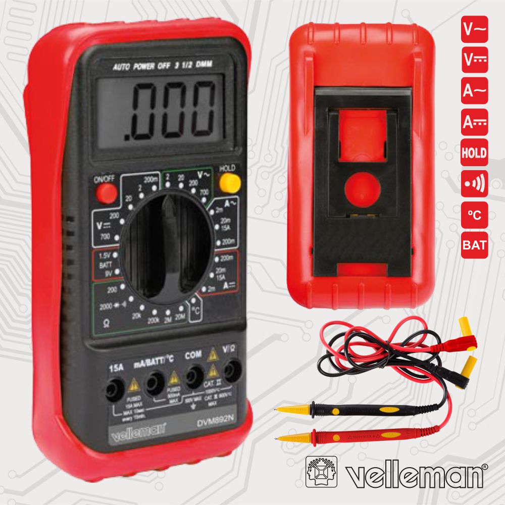 Home MULTÍMETROS DIGITAIS MULTÍMETRO DIGITAL 3½ DÍGITOS 24 ESCALAS 10A TEMP. CAP. FREQ MULTÍMETRO DIGITAL 3½ DÍGITOS 24 ESCALAS 10A TEMP. CAP. FREQ SKU: DVM892N 33,80 € Desconto de %. IVA incluído. Comprar Contactar Adicionar à wishlist - Multímetro digital c/ Visor 3 ½ dígitos 1999 - DMM c/ indicação auto, 24 escalas, estojo - Tensão AC/DC: 700V, corrente AC/DC: 15A - Medição temperatura, bateria, diodos, frequência, capacidade - Alimentação: 1x bateria 9V (inc.) Marca VELLEMAN Tags FERRAMENTAS INSTRUMENTAÇÃO MULTÍMETROS DIGITAIS Características Partilhar
