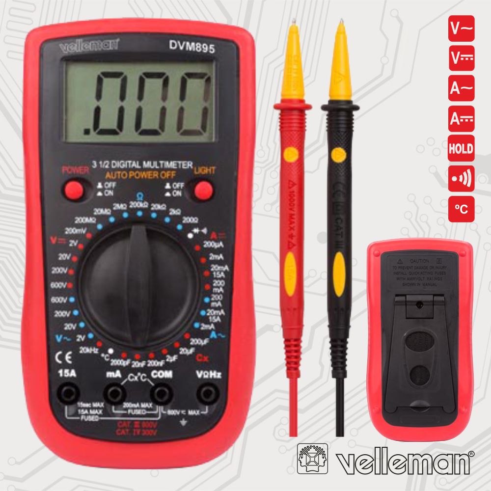 Home MULTÍMETROS DIGITAIS MULTÍMETRO DIGITAL 3½ DÍGITOS CATIII600VCATIV300V VELLEMAN MULTÍMETRO DIGITAL 3½ DÍGITOS CATIII600VCATIV300V VELLEMAN SKU: DVM895 40,60 € Desconto de %. IVA incluído. O produto encontra-se sem stock. Adicionar à wishlist - Multímetro digital c/ Visor 3 ½ dígitos 1999 - Ajuste a Zero auto., termopar -50~+800ºC - Tensão AC/DC: 600V, corrente AC/DC: 10A - Medição temperatura, frequência,capacidade bateria, diodos, alimentação 1x bateria 9V (inc. Marca VELLEMAN Tags FERRAMENTAS INSTRUMENTAÇÃO MULTÍMETROS DIGITAIS Características Partilhar