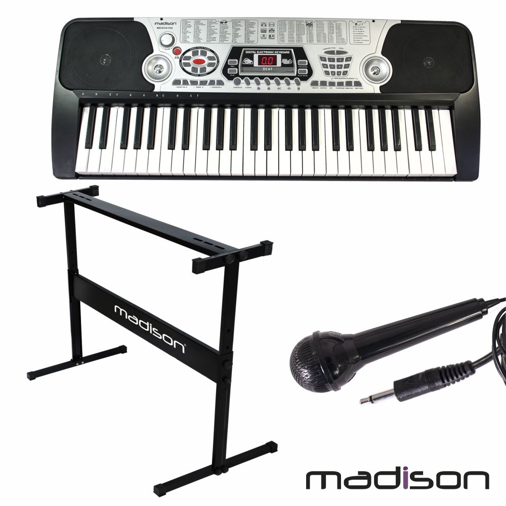 - Teclado musical c/ 54 teclas, MIC e suporte - 5 Teclas de percussão e sons de animais - Visor LED, 100 timbres e 100 ritmos, inclui MIC - 8 Sons demo, divisão do teclado - Acordes c/ acompanhamento múltiplo/único - Alimentação: 9Vdc ou 6 pilhas D (não inc.)