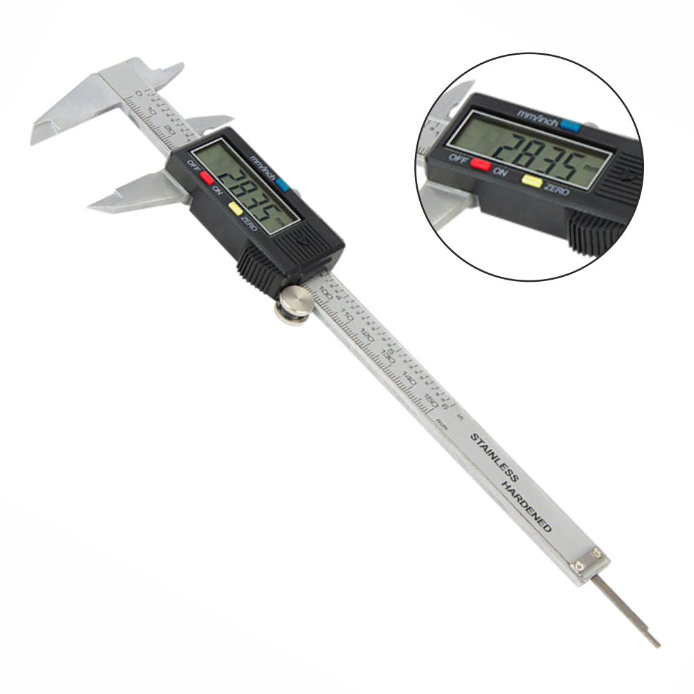 - Peclise digital 150mm (6") em Aço inoxidável - Unidades de medida: métrica e imperial - Resolução: 0.01mm e 0.005", Visor digital - Sistema de medição capacitiva linear - Precisão: 0.02mm